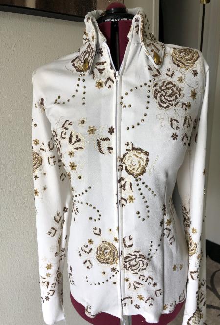 | THIS JACKET WILL DEFINITELY MAKE AN ENTRANCE. GORGEOUS CREAMY WHITE FUKURO . IF YOU ARE NOT FAMILIAR WITH FUKURO IT IS A HIGH END TEXTURED STRETCH FABRIC. I AM SAD AS WE ARE NO LONGER GETTING IT HERE IN THE US. THIS GORGEOUS PIECE HAS DIFFERENT SHADES OF GOLD AND BROWN EMBROIDERED METALLIC THREADS IN A FEMININE ROSE PATTERN. I USED AURUM (GOLD) CRYSTALS IN DIFFERENT SIZES THROUGHOUT . IT HAS SOME STRETCH OR I CAN TAKE INWARD IF NEEDED. BUST- 43 IT WILL STRETCH SOME OR I CAN TAKE INWARD IF NEEDED WAIST-38 1/2 HIP-43 BACK LENGTH SLEEVE LENGTH CLEARANCE!!!! $289 INCLUDING US SHIP/INSURANCE AND ALTERATIONS EMAIL QUESTIONS PLEASE REFER TO GOING FOR GOLD |