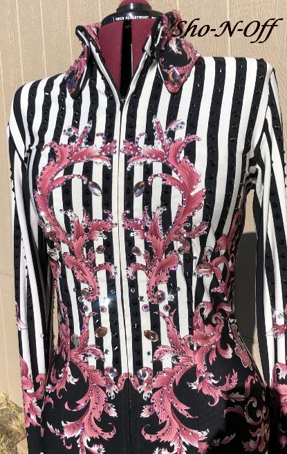 | STRIPES ARE SO IN RIGHT NOW!! AND THIS ONE HAS ITS OWN TWIST WITH THE PINK BORDER. THIS ONE IS TRULY ONE OF A KIND AS I HAND CUT THE UPPER FRONT APPLIQUES. IT IS LOADED WITH LIGHT ROSE AND CLEAR CRYSTALS THROUGHOUT IN DIFFERENT SIZES AND SHAPES. BLACK STRIPES HAVE BLACK CONE SHAPED CRYSTALS ON EACH STRIPE. SO THIS ONE SHINES FROM ALL ANGLES IN THE SUN. IT DOES STRETCH OR I CAN TAKE INWARD IF NEEDED. PLEASE PM ME QUESTIONS. BUST- 39 will easily stretch to 41/42 or I can take inward if needed WAIST-34 HIP-40 SLEEVE SALE PRICED $ 585 including alterations and US ship/Insurance EMAIL QUESTIONS PLEASE REFER TO CENTER OF ATTENTION |