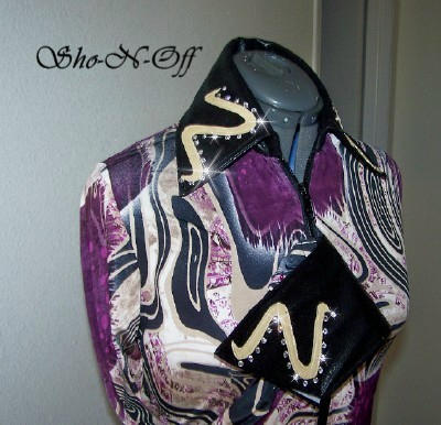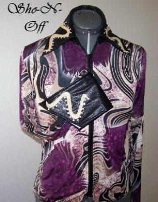 | GORGEOUS AUBERGINE BLEND RAIL SHIRT IN SUPER SOFT POLY LYCRA. VERY VERSATILE AS IT CAN BE WORN WITH SAND OR BLACK CHAPS. PRINCESS SEAMS FRONT AND BACK FOR TAILORED FIT. CAN BE ALTERED INWARD FOR NO ADDITIONAL CHARGE AHS ABOUT AN INCH OF STRETCH THROUGHOUT. COLLAR AND DETACHABLE CUFF ARE BLACK SUEDED ULTRALEATHER AND FINISHING COORDINATING ONE OF A KIND DESIGN IS PEARLIZED CHAMPAGNE LAMBSKIN AND CLEAR SWAROVSKI CRYSTALS. BUST-35-36 $185.00 WAIST-31 HIPS-36 SLEEVES 24 1/2 SUPER FALL SALE $125.00 BACK LENGTH CANBE 21 OR 22 FOR PERFECT OVER CHAPS FIT. EMAIL QUESTIONS PLEASE REFER TO AUBERGINE SWIRL RAIL SHIRT |