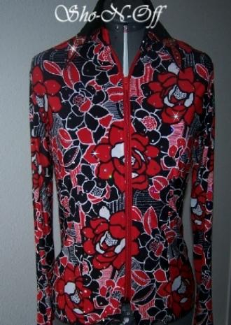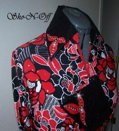 | GORGEOUS RED, BLACK AND WHITE COMBO WITH AURORA BOREALIS DOTS BUILT RIGHT IN FOR ALL OVER CRYSTAL LOOK SHINE! HIGH END POLY LYCRA IN A BLACK AND RED AND WHITE FLORAL DESIGN. PRINCESS SEAMS FROTN AND BACK FOR TAILORED FIT. COLLAR AND DETACHABLE CUFFS ARE BLACK ULTRA LEATHER WITH A ONE OF AKIND RED LAMBSKIN LEAF DESIGN, WITH HAND PAINTED BLACK LINES AND CLEAR SWAROVSKI CRYSTALS. VERY FEMININE AND VERY EYE CATCHING. WILL STRETCH A COUPLE OF INCHES OR CAN BE ALTERED INWARD FOR NO ADDITIONAL CHARGE. BUST-38 WILL EASILY FIT BUST 34-41 WAIST-33 $185.00 HIPS-39 SALE $125.00 SLEEVE LENGTH -25 BACK LENGTH CAN BE SET FROM 21 TO 23 YOUR CHOICE EMAIL QUESTIONS PLEASE REFER TO BLACK/RED RAIL SHIRT |