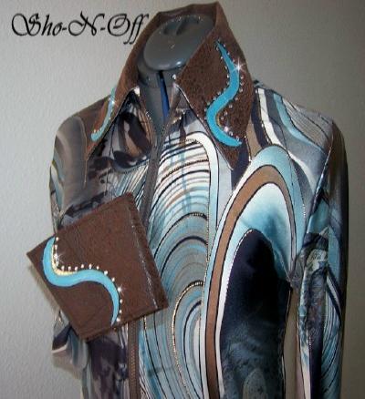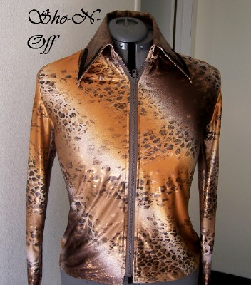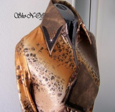| THIS ONE IS MADE OF SUCH PRETTY FABRIC. IT IS A HIGH END POLY LYCRA IN BROWNS, BLACK AND COPPERS WITH AN ANIMAL PRINT AND IT JUST SHIMMERS. COLLAR AND SEPARATE CUFF ARE A COPPERY ULTRA LEATHER ALSO WITH BLACK SNAKESKIN DESIGNED LAMBSKIN OVERLAYS AND FINISHED WITH SMOKED TOPAZ SWAROVSKI CRYSTALS. HIGH END POLY LYCRA WITH ABOUT 1 INCH OF STRETCH! CAN BE ALTERED INWARD FOR NO ADDITIONAL CHARGE. BUST-36 WILL FIT 34-38 $139.00 WAIST 32 1/2 CLEARANCE for Christmas $95.00 BACK LENGTH-22 1/2 EMAIL QUESTIONS # 3 copper top rail shirt |