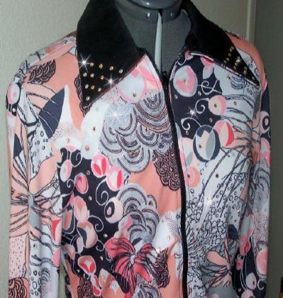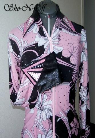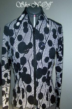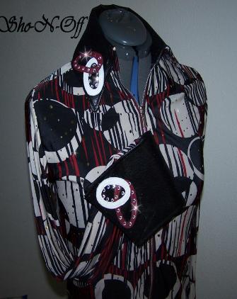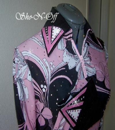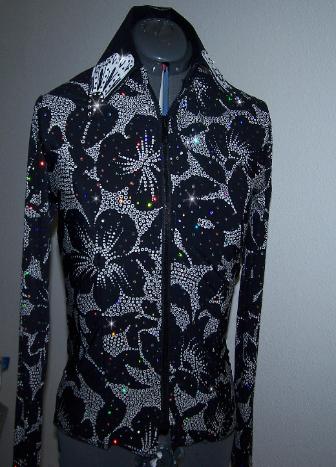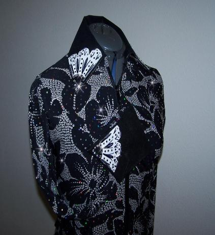 | THIS IS THE PRETTIEST MATERIAL....WOW! CLASSIC BLACK AND WHITE WITH HOLOGRAPHIC DOTS ALL OVER THAT JUST SHINE IN THE SUN OR INDOOR ARENA LIGHTS. WILL STRETCH SEVERAL INCHES OR CAN BE ALTERED INWARD PRINCESS SEAMS FRONT AND BACK. COLLAR AND DETACHABLE CUFFS ARE BLACK ULTRA LEATHER WITH WHITE LAMBSKIN ONE OF A KIND HAND PAINTED FLORAL DESIGN. FINISHED WITH JET AND CLEAR SWAROVSKI CRYSTALS. BUST-38 WILL EASILY FIT 35-41 WAIST-33 SALE $130.00 HIPS-39 LENGTH-23 EMAIL QUESTIONS PLEASE REFER TO BLACK FLORAL RAIL SHIRT |