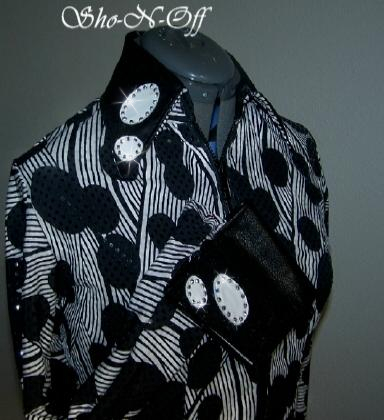 | THIS IS AN AMAZING GET YOU NOTICED BLACK AND WHITE...STRIPES ARE SLIMMING AND THE POLKA DOTS ARE EFFECTIVE FOR EYE CATCHING. IT IS THEN COVERED WITH CLEAR SEQUINED DOTS ALL OVER FOR MAXIMUM OUTDOOR OR UNDER LIGHT SHINE. PRINCESS SEAMED FOR TAILORED LOOK FRONT AND BACK, HAS SEVERAL INCHES OF STRETCH OR CAN BE ALTERED INWARD FOR NO ADDTIONAL CHARGE. COLLAR AND DETACHABLE CUFF HAVE A CONTRASTING DESIGN TO COMPLIMENT THE SHIRT IN ARCTIC WHITE PLONGE LEATHER WITH SWAROVSKI CRYSTALS AROUND THE EDGE. BUST-38 WILL EASILY FIT BUST 36-41 WAIST-32 $165.00 HIPS-39 BACK LENGTH IS 22 1/2 SUPER SALE $125.00 SLEEVE IS 24 1/2 AND HAS A ONE INCH HEM.... EMAIL QUESTIONS PLEASE REFER TO POLKA DOT RAIL SHIRT. |
