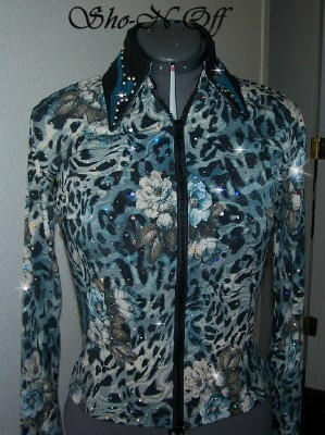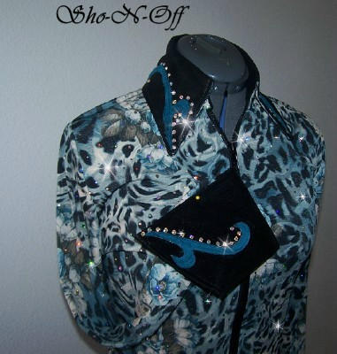 | SUPER PRETTY AND SUPER GLITZY.... ANIMAL AND FLORAL COME TOGETHER IN THIS GORGEOUS RAIL SHIRT. A BEAUTIFUL BLEND OF BLUES AND TURQUOISE COMBINED WITH CREAM AND BLACK. THEN OVERLAYED WITH AB DOTS ALL OVER FOR ADDED ARENA SHINE. BLACK ULTRA LEATHER SUEDED COLLAR AND CUFF FINISH THIS SHIRT WITH A ONE OF A KIND SUEDED LAMBSKIN DESIGN AND AB SWAROVSKI CRYSTALS. pRINCESS SEAMED FOR TAILORED FIT. BUST-40 $185.00 WAIST-33 HIPS-41 SUPER FALL SALE $125.00 SLEEVE-25 LENGTH-22 EMAIL QUESTIONS PLEASE REFER TO ROSES AND ANIMAL RAIL SHIRT |