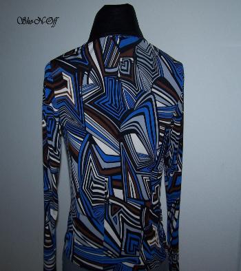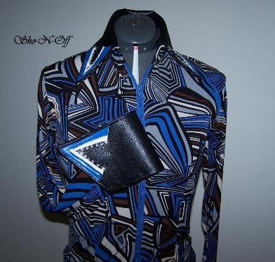 | SUPER PRETTY SAPPHIRE BLUE, WHITE, BLACK, GREY AND BROWN POLY LYCRA STRETCH IN A NEAT GEOMETRIC DESIGN. BLACK COLLAR DETACHABLE CUFFS ARE ULTRA LEATHER AND FINISHED WITH A LAMBSKIN DESIGN IN ROYAL AND WHITE AND CLEAR SWAROVSKI WILL STRETCH SEVERAL INCHES OR CAN BE ALTERED INWARD FOR NO ADDITIONAL CHARGE. BUST-36 WILL EASILY FIT BUST 33-39 $175.00 waist-30 HIPS-37 SALE $120.00 SLEEVE-24 BACK LENGTH-21 1/2 EMAIL QUESTIONS PLEASE REFER TO BLUE DIAMOND RAIL SHIRT |