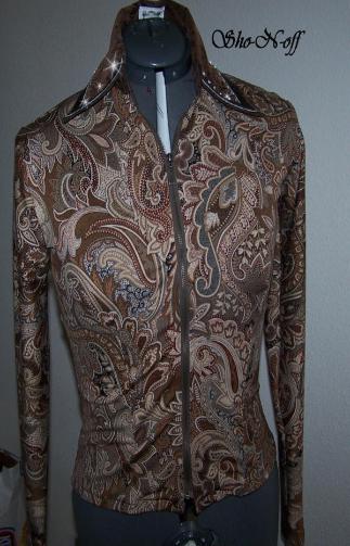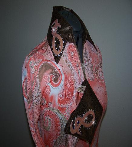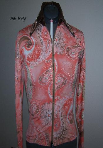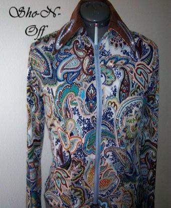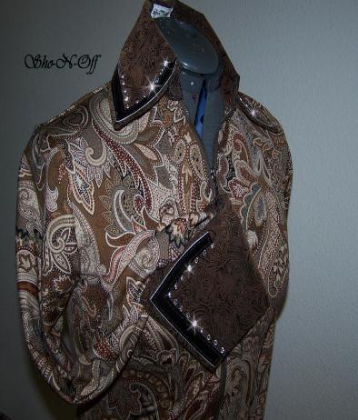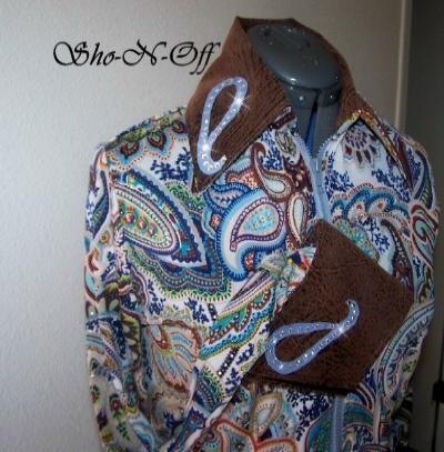 | THIS ONE WILL GO WITH YOUR BROWN, BLACK OR SAND CHAPS, VERY VERSATILE.... ONE SHIRT WITH A LOT OF DIFFERENT LOOKS IF YOU CHANGE CHAPS OR PADS..... VERY PRETTY SHADES OF BROWN, CREAM AND BLACK PAISLEY PRINT IN A SUPER SOFT POLY LYCRA. COLLAR AND DETACHABLE CUFFS ARE BROWN TOOLED ULTRA LEATHER WITH A BLACK PIG SKIN OVERLAY AND FINISHED WITH CLEAR SWAROVSKI CRYSTALS. WILL STRETCH SEVERAL INCHES OR CAN BE ALTERED INWARD, PRINCESS SEAMED FOR A TAILORED LOOK OVER CHAPS. BUST-35 WILL EASILY FIT BUST 33-40 WAIST-30 HIPS-36 $180.00 SALE $115.00 FREE SHIP TILL CHRISTMAS SLEEVE-24 BACK LENGTH-22 EMAIL QUESTIONS PLEASE REFER TO BROWN PAISLEY RAIL SHIRT |