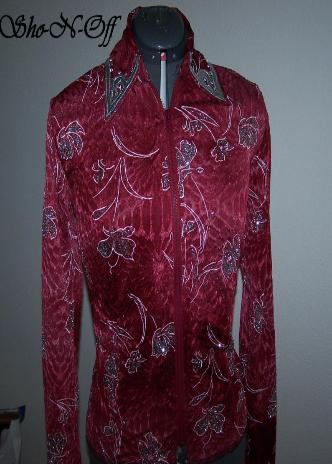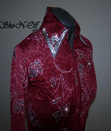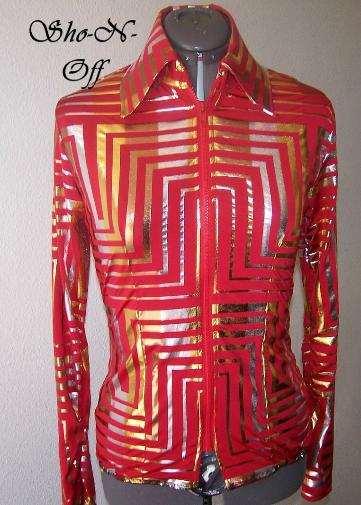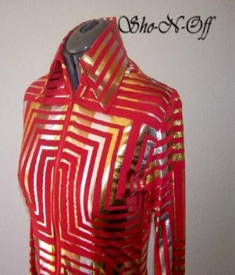 | WHAT A FUN FABRIC...TRUE CHERRY RED WITH A BOLD METALLIC GEO PATTERN IN GOLD, SILVER AND BRONZE. FOUR WAY STRETCH AND HAS PRINCESS SEAMS FRONT AND BACK FOR TAILORED FIT. I DID NOT ADD BLING, I THINK IT HAS ENOUGH BUT IF YOU DONT PLEASE EMAIL ME. WILL STRETCH SEVERAL INCHES OR CAN BE ALTERED INWARD FOR NO ADDITIONAL CHARGE BUST-38 WAIST-32 $125.00 SALE $85.00 HIP-39 SLEEVES-25 BACK LENGTH CAN BE SET FROM 21 TO 23 INCHES YOUR CHOICE EMAI LQUESTIONS PLEASE REFER TO RED FOIL SHIRT |