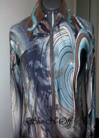 | VERY EYECATCHING AND FEMININE. BLEND OF CHOCOLATE, GREY, CHARCOAL WHITE AND SEVERAL COLORS OF TURQUOISE. THEN LAMBSKIN AND GOLD LAMBSKIN AND FINISHED WITH CLEAR SWAROVSKI CRYSTALS. SUPER PRETTY AND EYE CATCHING COMBO. WILL STRETCH SEVERAL INCHES OR CAN BE ALTERED INWARD FOR NO ADDITIONAL CHARGE. BUST-38 WILL EASILY FIT 35-42 $185.00 WAIST-34 HIP-39 SUPER SALE $130.00 SLEEVE-25 BACK LENGTH CAN BE SET FROM 22 TO 23 1/2 - YOUR CHOICE. EMAIL QUESTIONS PLEASE REFER TO CHOCO BLUE RAIL SHIRT |