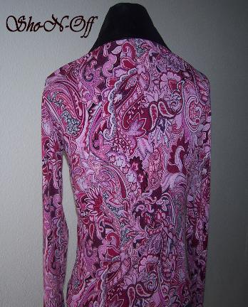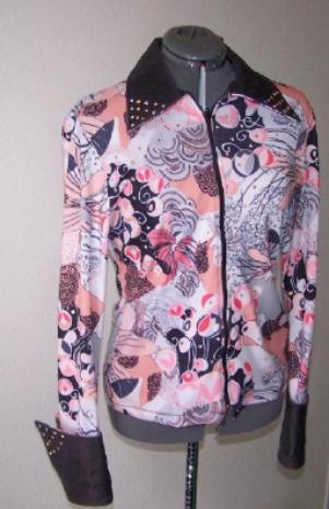 | Super pretty paisley fuschia, pink, white and black blend. high end poly lycra in four way stretch. Fuschia zipper with pretty metal pull. Collar and detachable cuff are black sueded ultraleather with a fuschia lambskin one of a kind design and finished with clear swarovski crystals. Princess seamed front and back for a tailored look and shorter length to be worn outside of the chaps if you choose to! Can be altered inward for no additional charge and will stretch about 2 inches. Bust-36 1/2 Waist-30 Hips-37 1/2 Sleeve-25 SALE $110.00 Back length-22 Email Questions please refer to fuschia paisley |