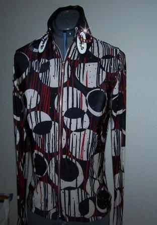 | VERY LIGHTWEIGHT PRETTY LYCRA FABRIC IN OFF WHITE, BLACK AND BURGUNDY CIRCLE PATTERN. COLL AR AND DETACHABLE CUFF ARE DONE IN BLACK ULTRA LEATHER AND FINISHED WITH A ONE OF A KIND DESIGN IN BURGUNDY AND WHITE LAMBSKIN AND FINISHED WITH SWAROVSKI CLEAR CRYSTALS. GOLD DOTS IN VARIOUS SIZES ARE ALL OVER THIS MATERIAL FOR ADDED EYE ATTENTION. FULL LENGTH ZIPPER WITH NICE ZIPPER PULL AND PRINCESS SEAMS FRONT AND BACK FOR TAILORED APPEARANCE EITHER TUCKED IN OR WORN OUT. WILL STRETCH ABOUT AN INCH AND A HALF OR CAN BE ALTERED INWARD FOR NO ADDITIONAL CHARGE. BUST-37 WILL EASILY FIT BUST 35-39 WAIST-32 $175.00 HIPS- 38 SALE $115.00 SLEEVE-24 1/2 BACK LENGTH-22 EMAIL QUESTIONS PLEASE REFER TO BURGUNDY CIRCLE RAIL SHIRT |