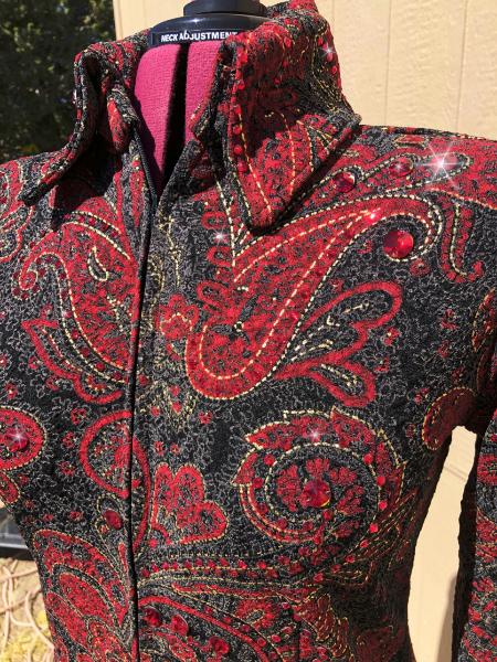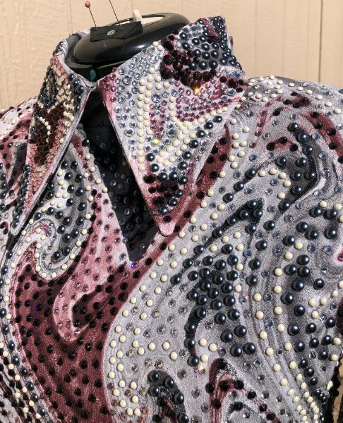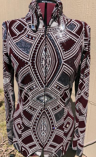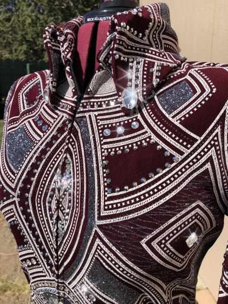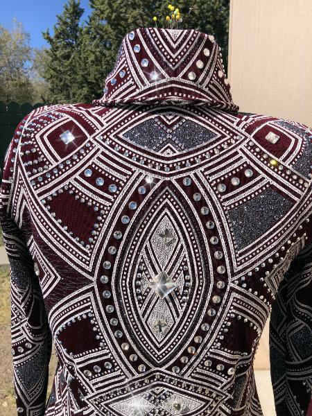 | THIS STUNNING PRINT IS BURGUNDY/wine , SILVER AND WHITE= I USED CLEAR AND SILVER LABRADOR EFFECT CRYSTALS TO FINISH IT. THE SILVER CRYSTALS LOOK AMAZING IN THE VIDEO AND IN PERSON BUT THEY WERE VERY HARD TO PHOTOGRAPH. WHEN I HAVE FINAL MEASUREMENTS I WILL FINISH THE HEM AND ANY NEEDED CRYSTAL WORK ON THE HEM LINE THAT NEEDS TO BE DONE. I HAVE LEFT IT FOR NOW AS MAYBE SOMEONE WILL WANT IT LONGER FOR SHOWMANSHIP OR HALTER AS IT DOES HAVE SOME SUBSTANCE TO THE FABRIC. bust-40 will stretch significantly or I can take inward quite a bit waist-36 hip-41 This one can be left longer for in hand or showmanship classes Email questions please refer to Nothing to Wine About |