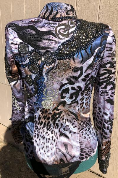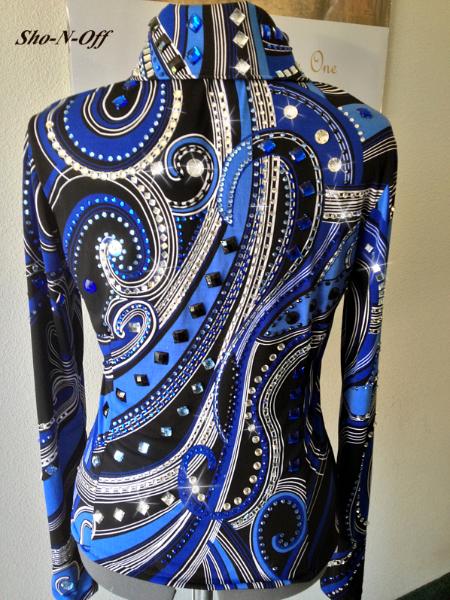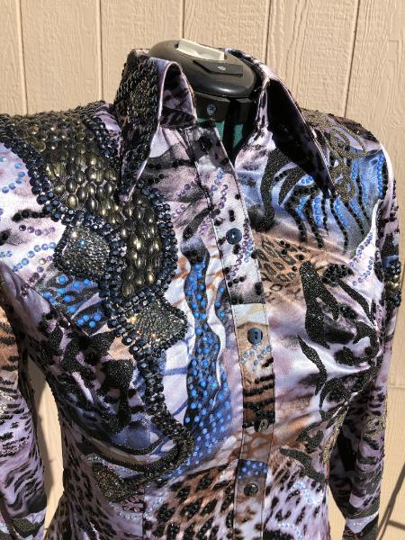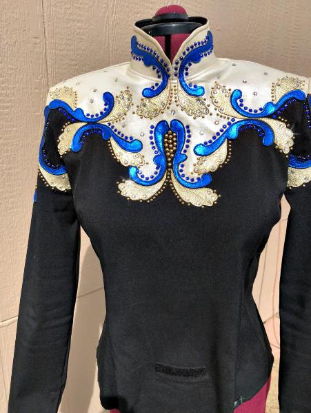 | SHOWGIRLS/LINDSEY JAMES HORSEMANSHIP BACK ZIP BODY SHIRT. BLACK BASE HAS A SMALL AMOUNT OF STRETCH- UPPER BODY IS LAMBSKIN IN CHAMPAGNE AND METALLIC BLUE AND GOLD. BUST-40 WAIST-34 SLEEVE-24 WITH ONE INCH HEM BACK SAME AS FRONT - VIDEO AVAILABLE EMAIL QUESTIONS PLEASE REFER TO HMS $185 SHIPPED US |