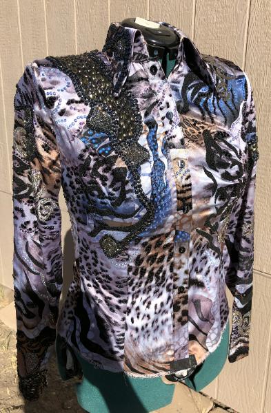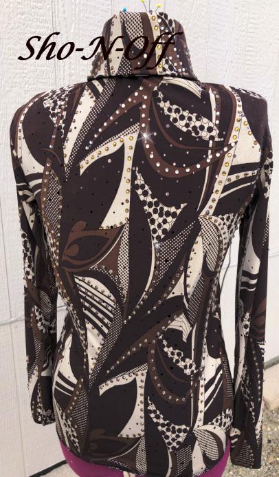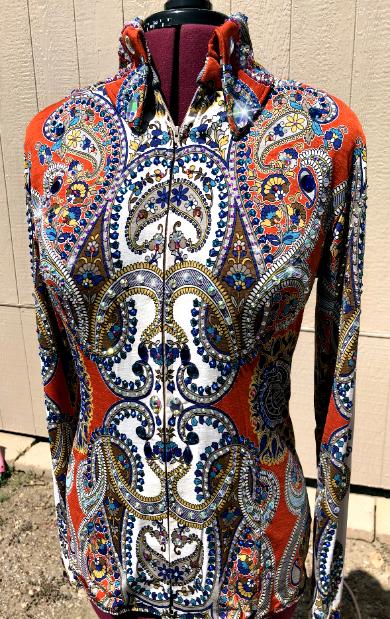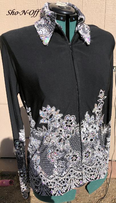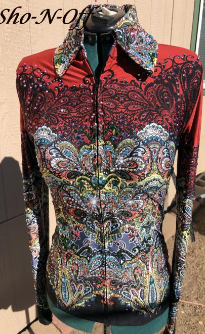 | ** CONSIGNMENT*** GORGEOUS Paulas Place WOULD BE AN AMAZING EDGY HORSEMANSHIP SHIRT OR REINING SHIRT. IS MEANT TO BE TUCKED IN AND HAS THE BODY SUIT FLAP AND VELCRO. ZIP FRONT WITH BUTTON PLACARD COVER. THIS SHIRT DOES NOT HAVE STRETCH SO YOU MUST MEASURE CAREFULLY. NO STRETCH- SLEEVES HAVE ZIPPERS AT CUFF AREA FOR EASY ACCESS I CAN TAKE IT INWARD FOR YOU IF NEEDED FOR NO ADDITIONAL CHARGE BUST- WAIST- HIP- SLEEVE |
