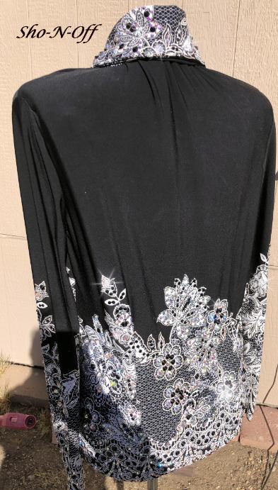 | THIS IS SUCH AN ELEGANT PIECE. TRUE BLACK WITH AN EMBOSSED CREAMY WHITE LACE LOOK BORDER. SAME BORDER MIRRORS THE SLEEVES AND THE COLLAR AND THEN IT IS COMPLETELY LOADED WITH CRYSTAL AB AND JET BLACK CRYSTALS. IT IS A BIT LARGER NOW BUT THE HIP IS LIMITED AS THE WHITE EMBOSS DOES NOT STRETCH AS MUCH AS THE PLAIN BLACK. BUST-44 IT WILL STRETCH A LITTLE MORE THAN THAT OR I CAN TAKE INWARD TO ABOUT A 38 (NO LESS) WAIST-37 HAS STRETCH OR I CAN TAKE INWARD HIP- MAX IS 45/46 BACK LENGTH -25 END OF SEASON SALE ONLY $389.00 EMAIL QUESTIONS PLEASE REFER TO ELEGANCE IS A MUST |