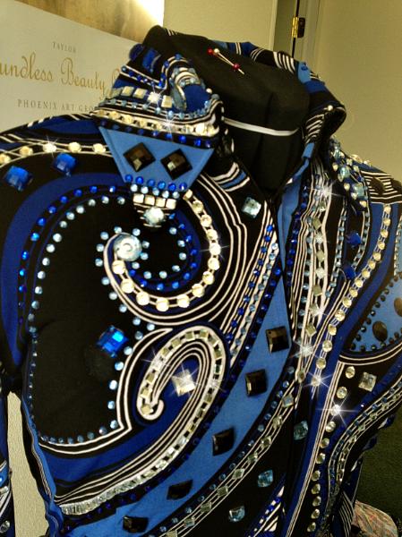 | THIS ONE WAS MY PERSONAL SHOW ENSEMBLE- I AM JUST SELLING AS I NEED TO PROMOTE NEW CLOTHES EVERY SEASON. WORN 3 TIMES IN PERFECT NEW CONDITION BUT WITHOUT THE NEW PRICE. UPPER LEVEL READY. COMPLETELY LOADED WITH DIFFERENT SIZES AND SHAPES OF CRYSTALS IN CLEAR, JET, LT AND REGULAR SAPPHIRE. I AM A MAYATEX DEALER IF YOU ARE INTERESTED IN THE THE MATCHING BLANKET. BUST-42 WILL FIT 40-45 AS IS- I CAN TAKE INWARD IF NEEDED WAIST-34 WILL FIT 33-37 AS IS OR I CAN TAKE INWARD HIP-42 SLEEVE-25 CAN BE ALTERED- WORN 3 TIMES ONLY $849 INCLUDING US SHIP BACK LENGTH- 23 EMAIL QUESTIONS- BLUER THAN BLUE |