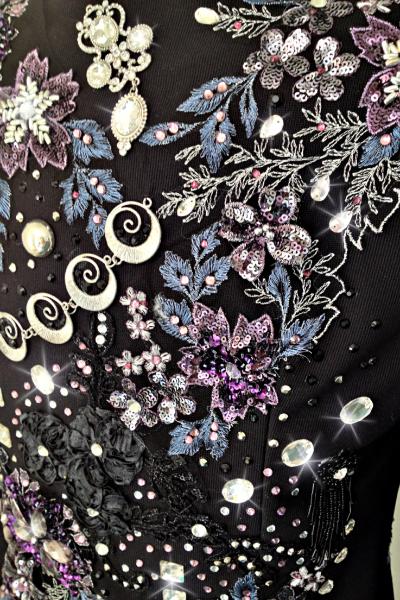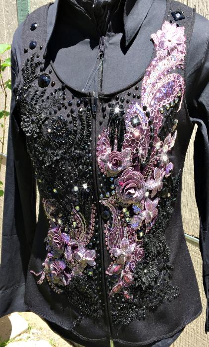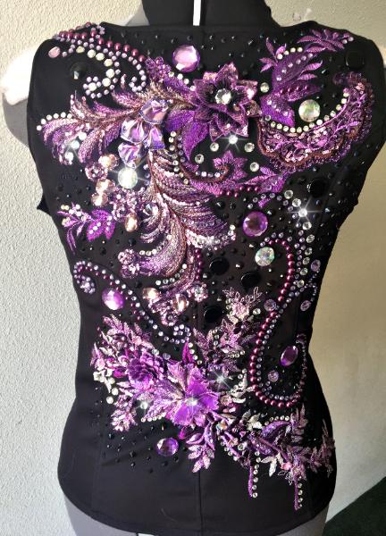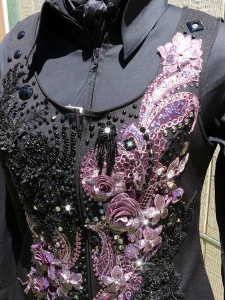| THIS GORGEOUS LACE VEST WILL TAKE YOU TO THE TOP AND YOU WILL LOOK LIKE A MILLION GETTING THERE! THE AMETHYST LACE HAS SILVER HIGHLIGHTS FOR EVEN MORE DEPTH AND DIMENSION- IT IS COMPLIMENTED WITH A DEEP BLACK HEAVILY BEADED LACE- TONS OF CRYSTALS TONS OF SHINE AND VERY FIGURE FLATTERING. I CAN TAKE THIS ONE INWARD TO FIT CUSTOM IF NEEDED- PLEASE EMAIL ME FITTING QUESTIONS BUST- the max will be 44- I can take way inward if needed as sides arent set yet WAIST-35 will go to 38/39 can be set way inward HIP-max 48 SALE PRICED AT $1250 WITH FREE US SHIP FOR LIMITED TIME EMAIL QUESTIONS PLEASE REFER TO STERLING ROSES |