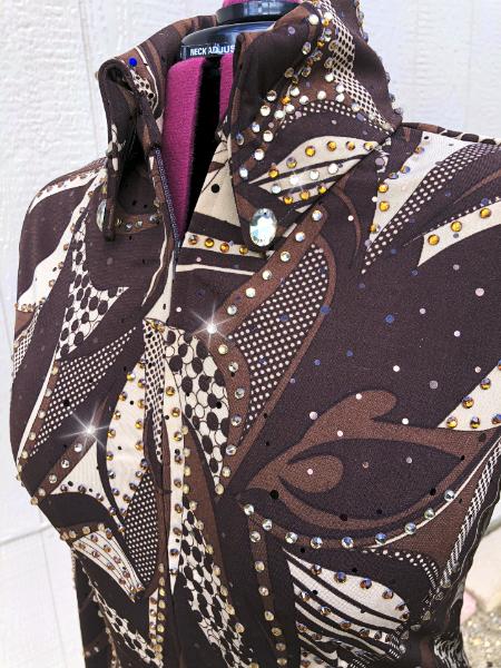 | PICTURES DO NOT COME CLOSE TO DOING THIS GORGEOUS PIECE JUSTICE. THERE ARE SO MANY DEPTHS OF BROWNS IN THE ONE AND THEN IT HAS BROWN DOTS BUILT INTO THE FABRIC FOR ADDED SHINE. I USED COFFEE AND LT COLORADO TOPAZ CRYSTALS THROUGHOUT. IF YOU LIKE BROWNS THIS ONE IS TRULY OVER THE TOP. THIS ONE HAS STRETCH OR I CAN TAKE IT INWARD IF NEEDED. BUST-38 WILL STRETCH OR I CAN TAKE INWARD- ALL MEASUREMENTS WILL STRETCH 2+ INCHES WITHOUT LOOKING OVERSTRETCHED WAIST-34 HIP-39 BACK LENGTH CAN BE SET FROM 22 1/2 TO 24 YOUR CHOICE CLEARANCE $289 includes us ship/insurance EMAIL QUESTIONS PLEASE REFER TO MOCHA LATTE PLEASE |