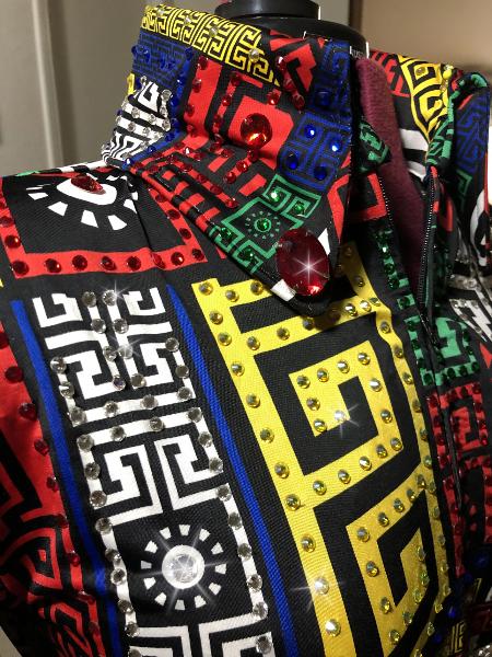 | THIS PIECE IS FOR THE BRAVE AND THE ONES THAT KNOW THEY ARE A WINNER. DEFINITELY GOING TO MAKE AN AMAZING STATEMENT IN THIS ONE! IT IS LOADED WITH COORDINATING CRYSTALS IN ALL OF THE SHIRTS COLORS. WOULD BE SUPER FUN PAIRED WITH THE RIGHT MATCHING PAD. I CAN REFER YOU TO CUSTOM PAD MAKERS THAT DO NOT CHARGE A LOT. THIS ONE IS RED, BLUE, GREEN, YELLOW, BLACK AND WHITE. SO FUN! BUST-39 will easily stretch to a 43/44 or I can take inward several inches WAIST-34 HIP-40 WOULD LOOK AMAZING WITH A PRIMARY COLOR PAD OR A CUSTOM WITH ALL OF THESE COLORS UPPER LEVEL READY $675 INCLUDES US SHIPPING/INSURANCE AND ALTERATIONS EMAIL QUESTIONS PLEASE REFER TO WINNING COLORS |