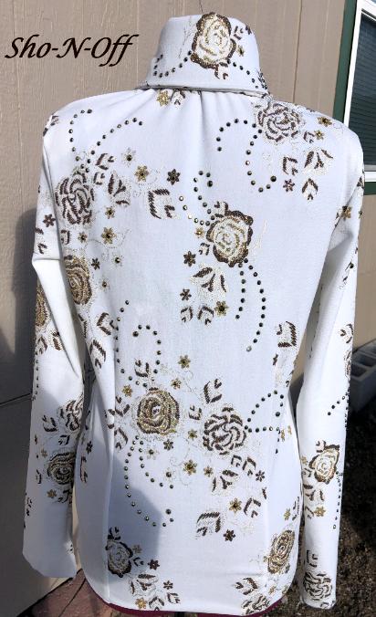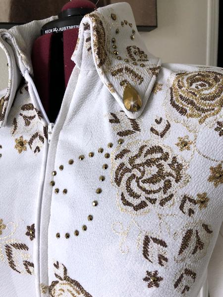 | THIS JACKET WILL DEFINITELY MAKE AN ENTRANCE. GORGEOUS CREAMY WHITE FUKURO . IF YOU ARE NOT FAMILIAR WITH FUKURO IT IS A HIGH END TEXTURED STRETCH FABRIC. I AM SAD AS WE ARE NO LONGER GETTING IT HERE IN THE US. THIS GORGEOUS PIECE HAS DIFFERENT SHADES OF GOLD AND BROWN EMBROIDERED METALLIC THREADS IN A FEMININE ROSE PATTERN. I USED AURUM (GOLD) CRYSTALS IN DIFFERENT SIZES THROUGHOUT . IT HAS SOME STRETCH OR I CAN TAKE INWARD IF NEEDED. BUST- 43 IT WILL STRETCH SOME OR I CAN TAKE INWARD IF NEEDED WAIST-38 1/2 HIP-43 BACK LENGTH SLEEVE LENGTH CLEARANCE!!!! $289 INCLUDING US SHIP/INSURANCE AND ALTERATIONS EMAIL QUESTIONS PLEASE REFER TO GOING FOR GOLD |