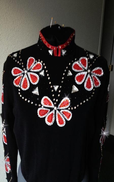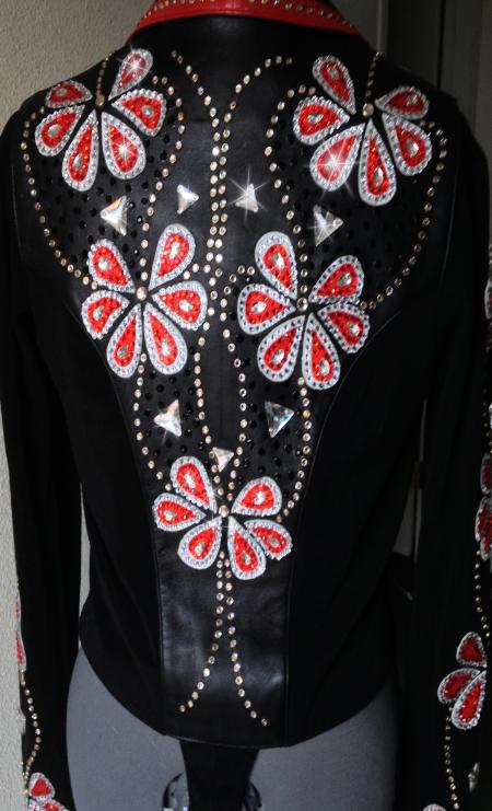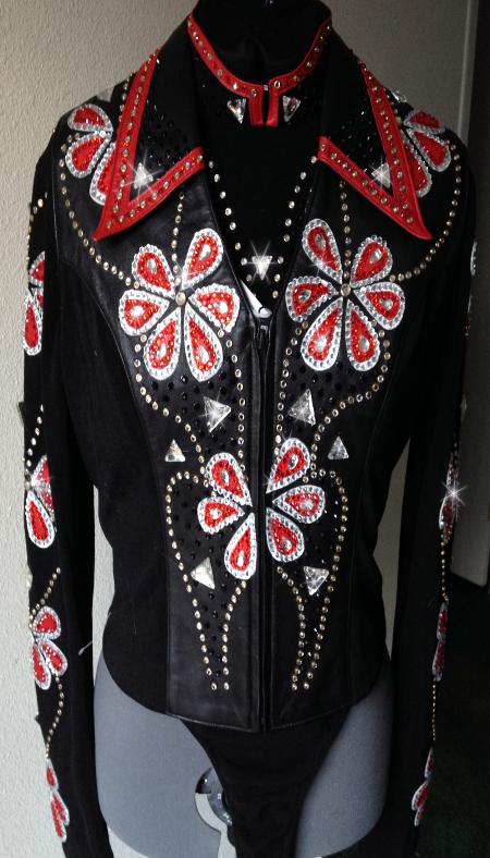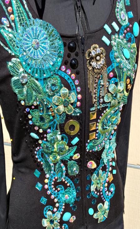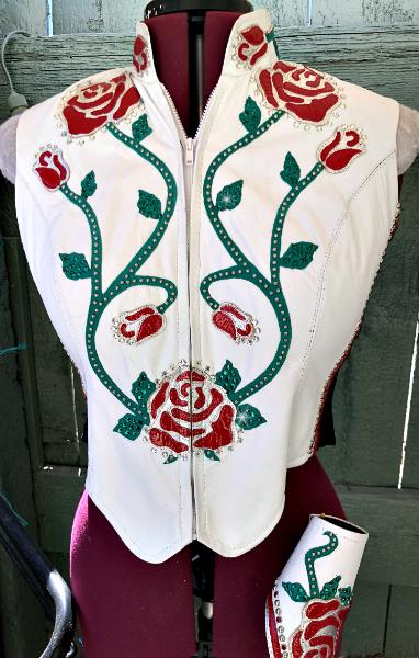| I AM REGRETTABLY SELLING THIS SET BECAUSE I WILL NOT BE HORSEMANSHIPPING :( THIS SET IS TRULY STUNNING IN PERSON. IT IS BRAND NEW- IT WAS A ONE OF A KIND FROM DOWN THE RAIL AND IS BRAND NEW- I THEN ADDED ALL OF THE CRYSTAL WORK EXCEPT THE GOLD RIM SET CRYSTALS- IT IS ABSOLUTELY LOADED AND FANCY. JUST THE HORSEMANSHIP SHIRT IS WORTH THE ASKING PRICE LET ALONE THE LAMBSKIN VEST. ALL APPLIQUÉS ARE LAMBSKIN AND ARE SEWN SECURELY IN PLACE. BOTH SHIRT AND VEST HAVE DESIGN FRONT AND BACK AND SLEEVES. SHIRT IS HEAVY STRETCH FABRIC WITH BACK ZIP. IT IS MARKED AND XL AND WILL FIT UP TO ABOUT A 50 BUST COMFORTABLY. IT IS A FULL BODYSUIT WITH LONG BACK ZIP FOR EASE OF GETTING INTO IT THE VEST IS NOT AS ACCOMMODATING - THE VEST HAS STRETCH SIDE INSERTS SO THE BUST WILL STRETCH TO ABOUT A 46 - HOWEVER THE WAIST WILL ONLY STRETCH TO ABOUT A 35... THEY LINED THE VEST BOTTOM WITH THE LEATHER MAKING IT NOT HAVE AS MUCH GIVE. IDEALLY THE VEST WILL FIT A 37-43 BUST THE MOST COMFORTABLY AND A 29-33 WAIST THE MOST COMFORTABLY. CLEARANCE PRICED AT AN AMAZING $750.00 EMAIL QUESTIONS PLEASE REFER TO FLORAL SET |