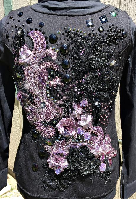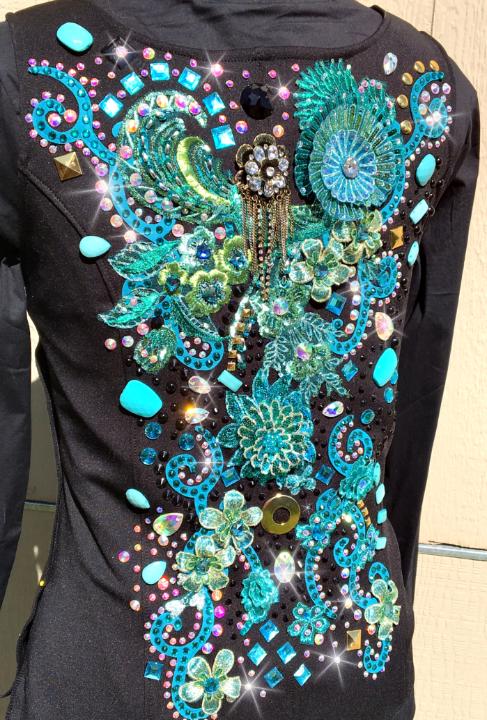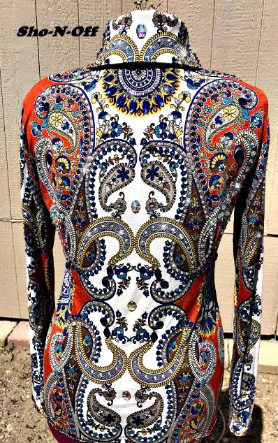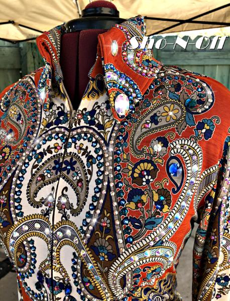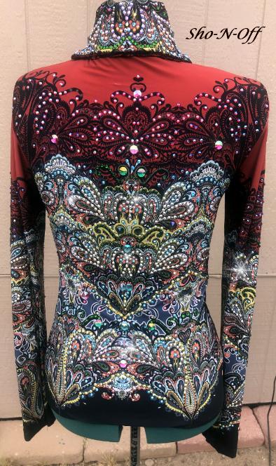 CONSIGNMENT **SHOWDRESSEDUP-RHINESTONES & REINS*** GORGEOUS HORSEMANSHIP BACK ZIP SHIRT. FULLY LOADED WITH CRYSTALS AND IS BRAND NEW. BUST- WAIST- HIP- BACK LENGTH CURRENTLY SALE PRICED AT $450 EMAIL QUESTIONS PLEASE REFER TO |