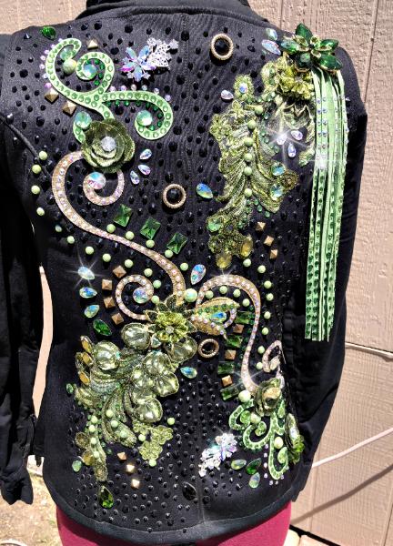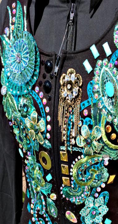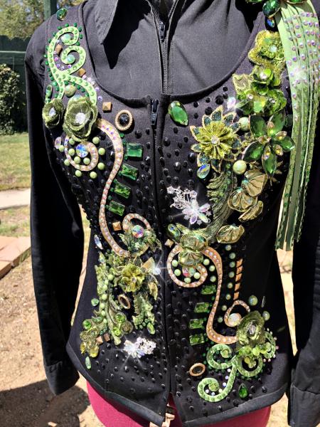 | THIS WAS MY OWN VEST AND PAD AND IT IS IN BRAND NEW USED CONDITION. SHIRT DOES NOT COME WITH IT BUT IF YOU NEED ONE I CAN GET YOU ONE. PICS DO NOT COME CLOSE TO DOING THIS ONE JUSTICE- I ALWAYS GOT GREAT COMPLIMENTS ON IT EVEN FROM THE JUDGES AT AQHA SHOWS. FINISHED MY SUPERIOR IN TRAIL IN IT. IT IS PRICED AT HALF OFF EVEN THOUGH IT IS IN PERFECT CONDITION. THE ULTRASUEDE OMBRE FRINGE IS REMOVEABLE OR IT CAN BE MOVED ELSEWHERE ON THE VEST IF WANTED. IT IS JUST PINNED WITH A LARGE BROOCH. IT HAS MULTIPLE COLORS OF GREEN AND GOLD IN IT AS DOES THE PAD- IT IS SUCH A GREAT HEAD TURNER. BUST- WAIST- HIP- $1100 INCLUDES VEST AND PAD AND US SHIPPING/INSURANCE EMAIL QUESTIONS PLEASE REFER TO GREEN WITH ENVY |
