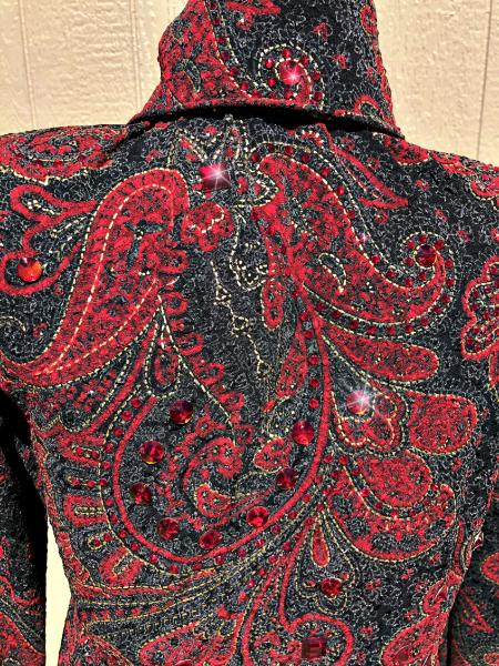 | ONE OF MY LAST REMAINING FUKURO PIECES. I AM SO SAD NOT TO BE ABLE TO GET THESE LOVELY TEXTURED FABRICS ANY LONGER. THIS ONE IS CHARCOAL, RED AND BLACK WITH TONS OF GOLD FOIL HIGHLIGHTS. WILL STRETCH QUITE A BIT OR I CAN TAKE INWARD. BUST-41 WILL STRETCH - PLEASE EMAIL ME FITTING QUESTIONS OR I CAN TAKE INWARD SEVERAL INCHES WAIST-35 HIP-42 BACK LENGTH- $525 INCLUDES US SHIPPING, INSURANCE AND ANY ALTERATIONS EMAIL QUESTIONS PLEASE REFER TO REDDY TO ROCK |