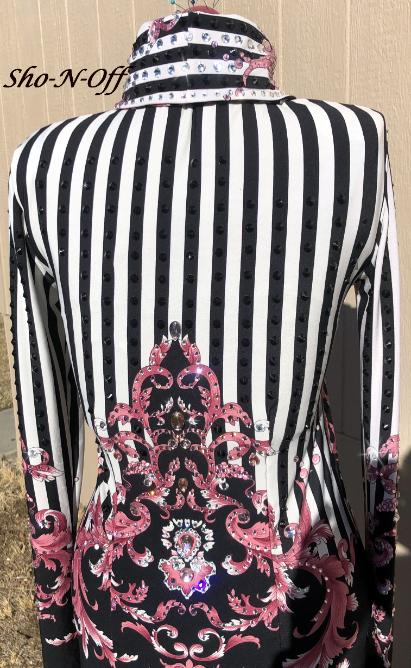 | STRIPES ARE SO IN RIGHT NOW!! AND THIS ONE HAS ITS OWN TWIST WITH THE PINK BORDER. THIS ONE IS TRULY ONE OF A KIND AS I HAND CUT THE UPPER FRONT APPLIQUES. IT IS LOADED WITH LIGHT ROSE AND CLEAR CRYSTALS THROUGHOUT IN DIFFERENT SIZES AND SHAPES. BLACK STRIPES HAVE BLACK CONE SHAPED CRYSTALS ON EACH STRIPE. SO THIS ONE SHINES FROM ALL ANGLES IN THE SUN. IT DOES STRETCH OR I CAN TAKE INWARD IF NEEDED. PLEASE PM ME QUESTIONS. BUST- 39 will easily stretch to 41/42 or I can take inward if needed WAIST-34 HIP-40 SLEEVE SALE PRICED $ 585 including alterations and US ship/Insurance EMAIL QUESTIONS PLEASE REFER TO CENTER OF ATTENTION |